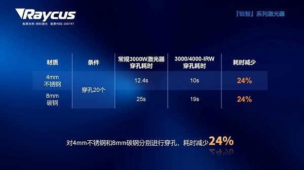 使用常規(guī)3000W激光器和銳智系列3000/4000-IRW激光器分別對4mm不銹鋼和8mm碳鋼進(jìn)行穿孔,其中常規(guī)3000W激光器穿孔耗時(shí)分別為12.4s和25s,3000/4000-IRW激光器穿孔耗時(shí)分別為10s和19s,耗時(shí)均減少24%。