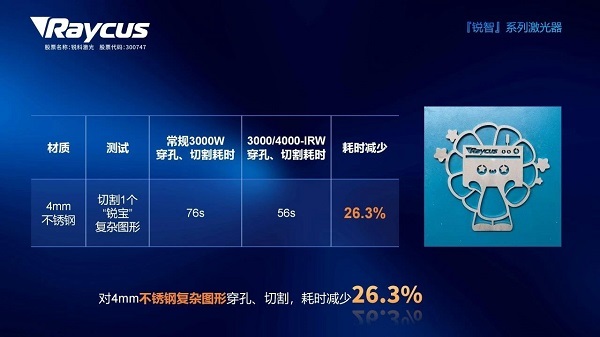 使用常規(guī)3000W激光器和銳智系列3000/4000-IRW激光器對4mm不銹鋼進(jìn)行復(fù)雜圖形穿孔、切割,其中常規(guī)3000W激光器耗時(shí)76s,銳智系列3000/4000-IRW激光器耗時(shí)56s,耗時(shí)相比減少26.3%。