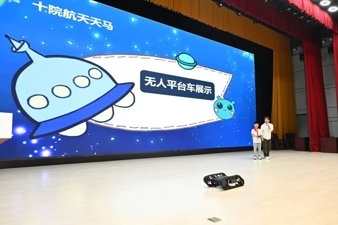 “同學(xué)們,你們知道火箭是怎么飛上天的嗎?”在活動現(xiàn)場,十院十部青年講師石龐從一個問答開始,為小朋友們帶來了一場趣味橫生的航天科普課堂?!爸袊夤趋揽梢詭臀姨?!”“看!那個無人車可以上樓梯!”十院航天天馬無人平臺車和十院航天控制外骨骼展示,瞬間點燃了現(xiàn)場氛圍。
