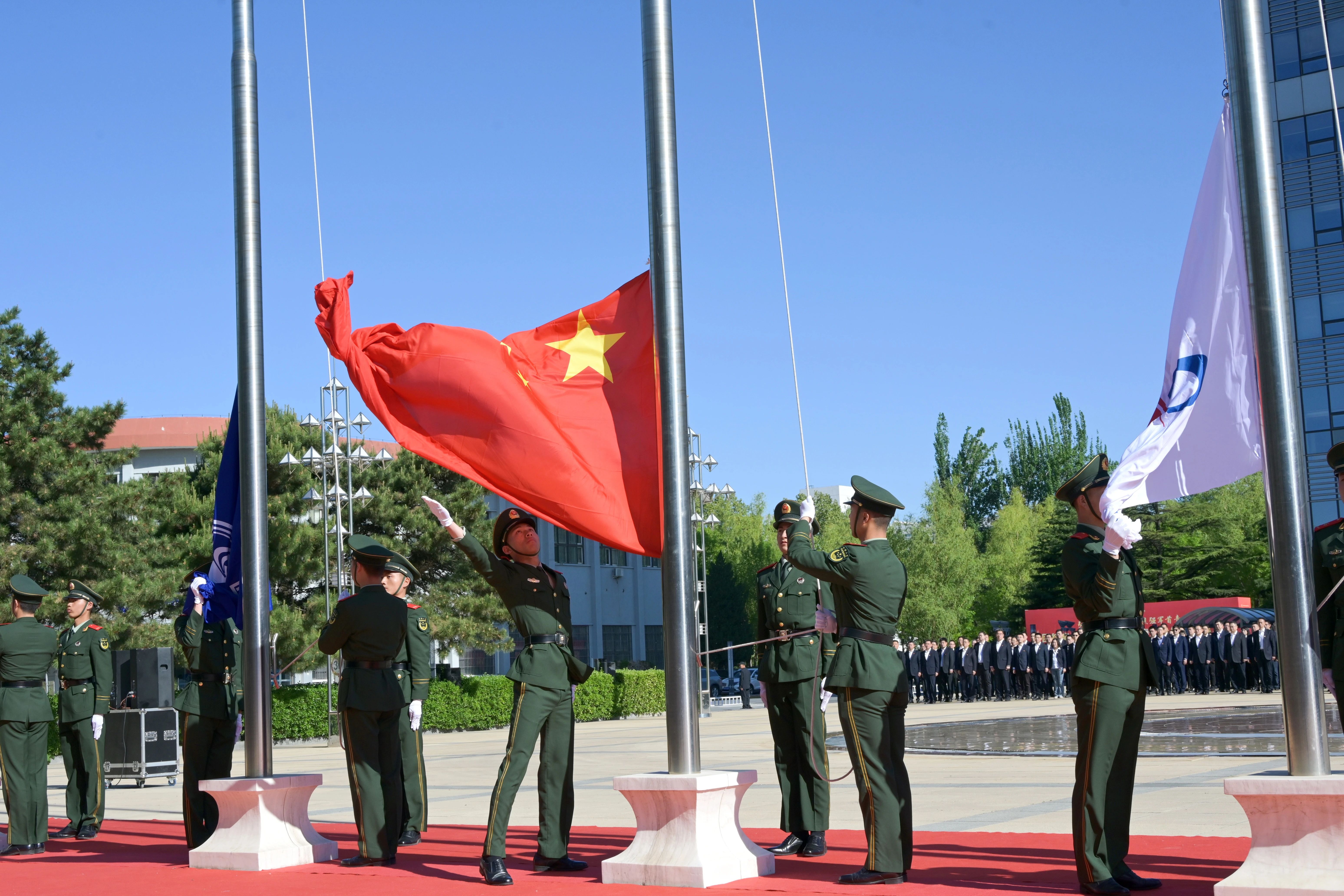 8點(diǎn)30分,國旗護(hù)衛(wèi)隊(duì)邁著鏗鏘有力的步伐,護(hù)送鮮艷的五星紅旗,昂首闊步走向升旗臺。伴隨著雄壯的國歌和航天科工之歌,國旗、集團(tuán)公司司旗和三院院旗冉冉升起,在場干部職工莊嚴(yán)肅立,行注目禮。