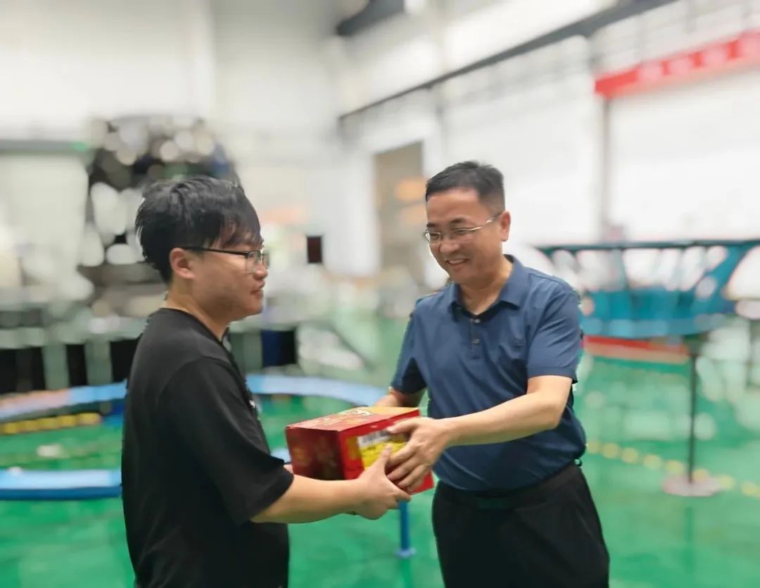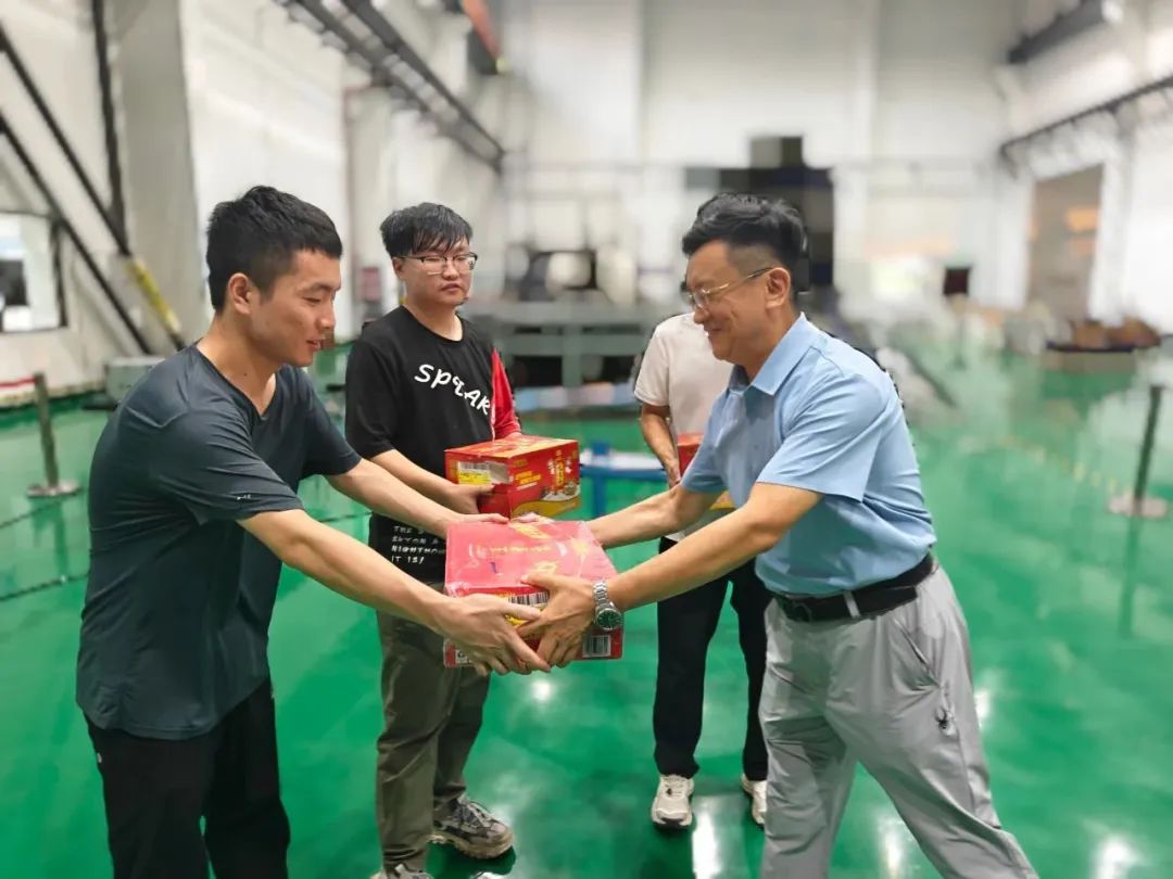 7月8日,航天三江黨委書記、董事長(zhǎng)高輝文,黨委委員、總會(huì)計(jì)師弓興隆前往快舟產(chǎn)業(yè)園慰問(wèn)高溫下奮戰(zhàn)一線的快舟試驗(yàn)隊(duì)員和各項(xiàng)目人員。